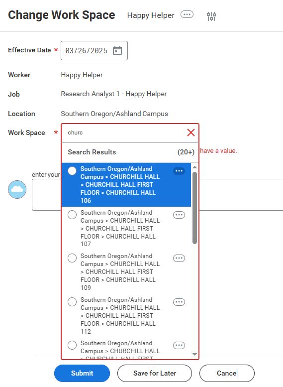 This guide covers how the designated Building Manager, as defined by SOU Facilities, Management, and Planning, can Change Work Space in Workday for an employee/building occupant. Work Space involves a string of information that identifies the campus, building, floor, and room.